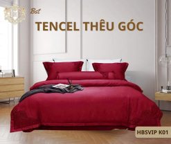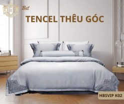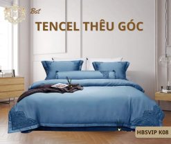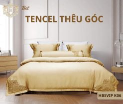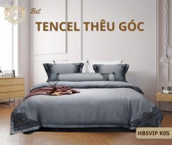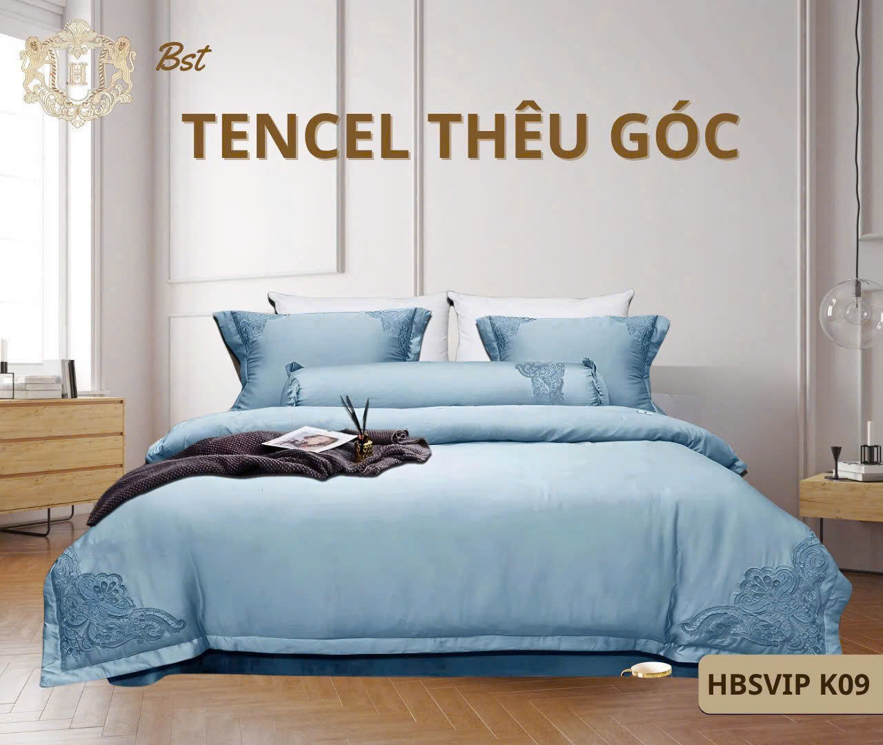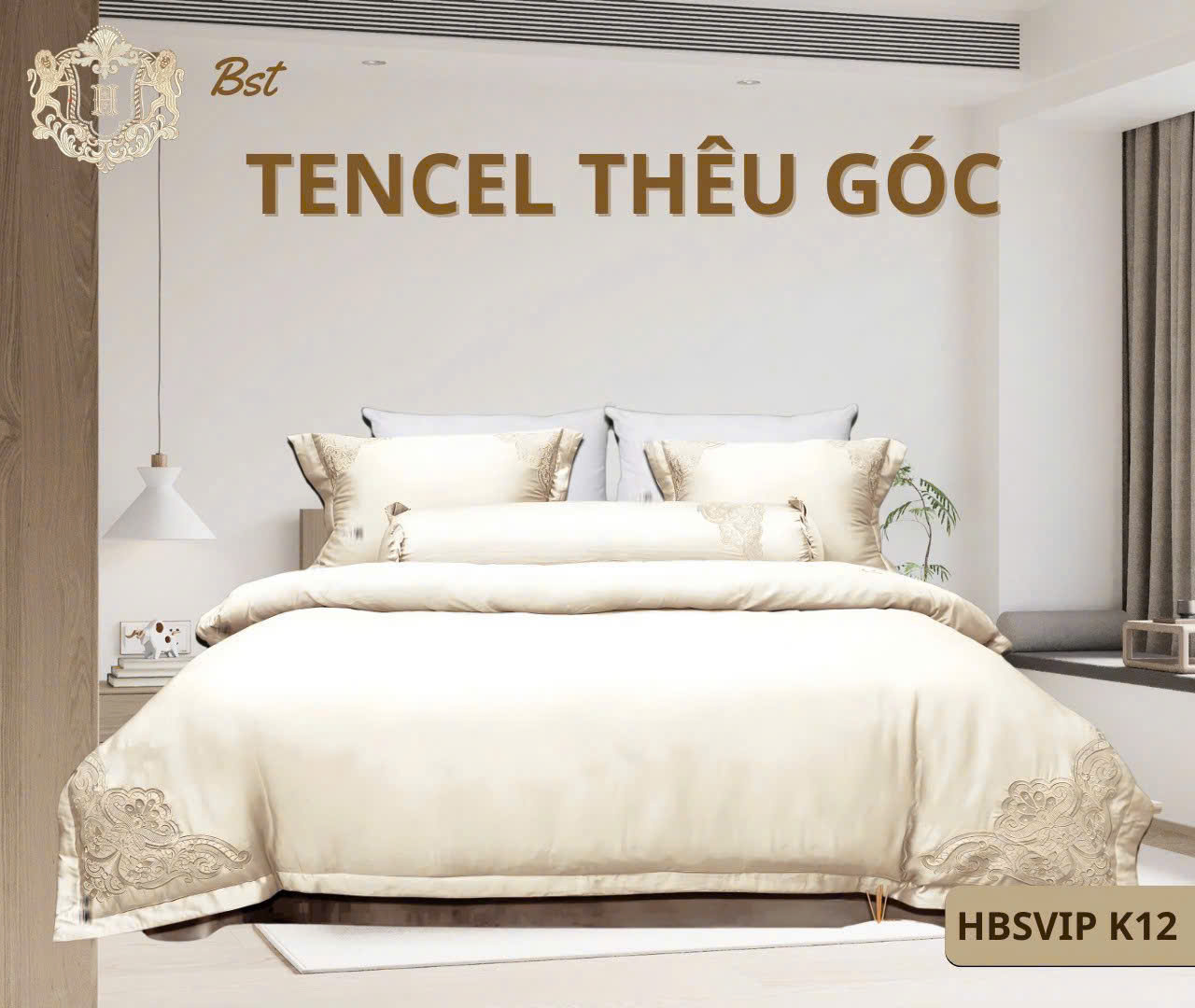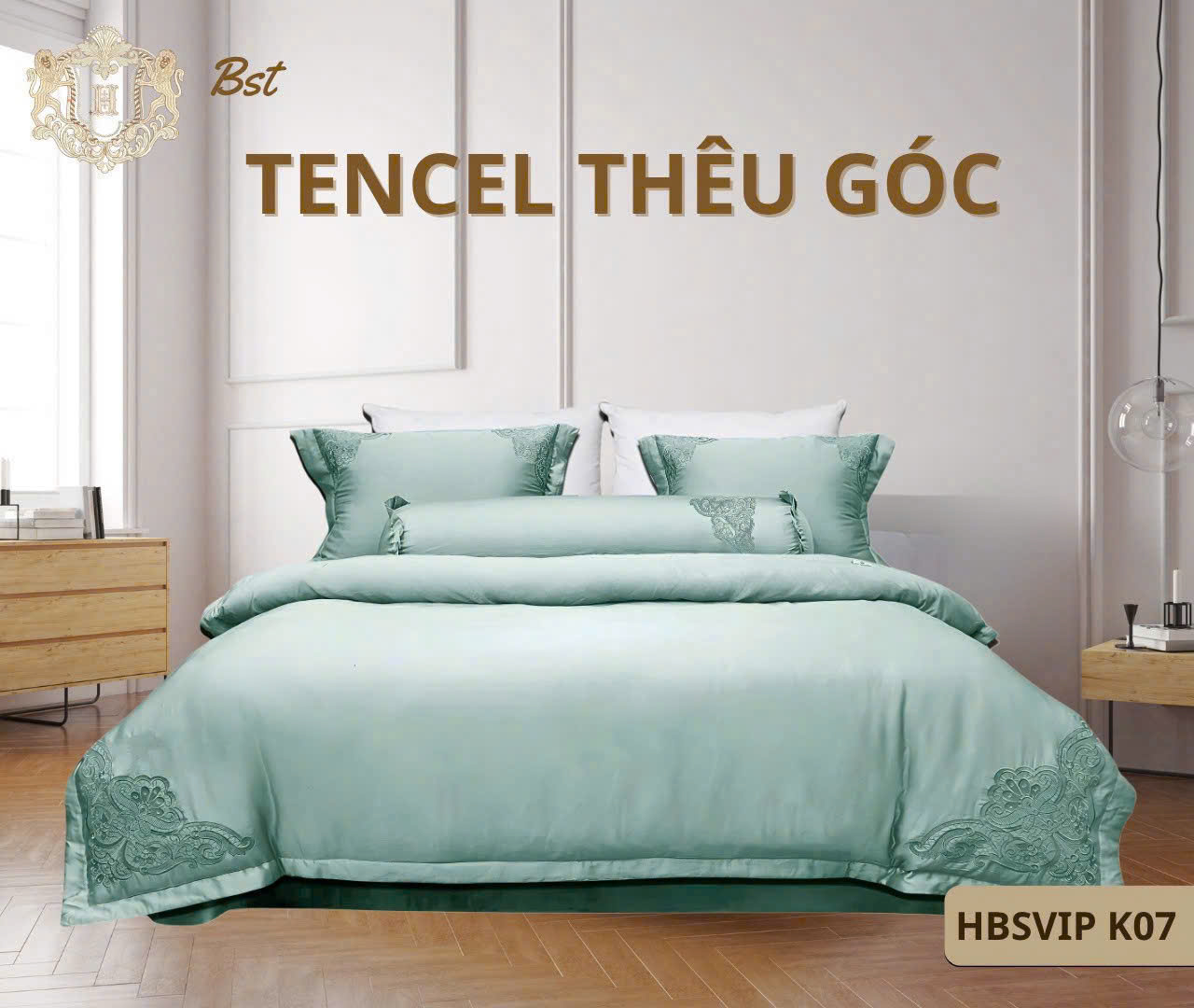 Bộ chăn ga 5 món cao cấp với mẫu thêu mới độc quyền 2025: đường nét hoa văn uốn lượn tinh xảo, thêu nổi 3D sắc nét trên nền vải lụa Tencel thiên nhiên mềm mịn, bóng nhẹ và thoáng khí.